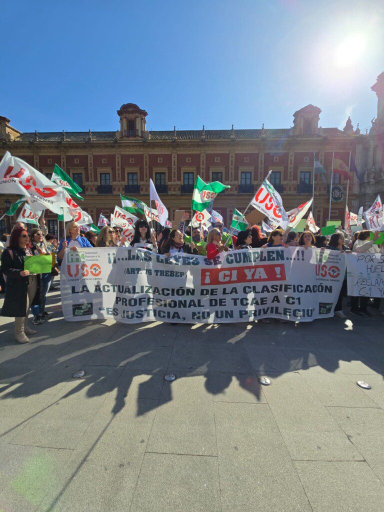Una multitud de Técnicos en Cuidados Auxiliares de Enfermería (TCAE) ha protagonizado una sonora protesta a las puertas de la Consejería de Sanidad, Presidencia y Emergencias en Sevilla. La...