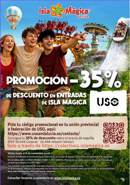 7 DE abril DE 2026Un año más, los/as afiliados/as de USO Andalucía pueden disfrutar de un 35% de descuento en las entradas de Isla Mágica, que abre sus puertas el próximo 11 de abril. Aprovecha esta ventaja exclusiva para colectivos y compra tus entradas en la... -