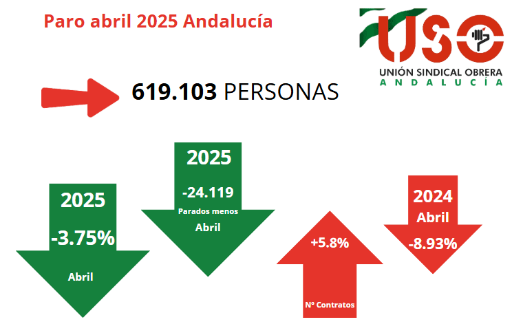 Indica Jesús Payán, Secretario de Acción Sindical y Empleo de USO Andalucía, que durante el mes de abril, el paro en Andalucía descendió en 24.119 personas, pero destaca que crecen los contratos a tiempo parcial aspecto que critica el Secretario, por tanto se representa una bajada del 3,75% y sitúa el número total de desempleados en 619.103, la cifra más baja desde agosto de 2008. Andalucía lideró la reducción del desempleo en España en términos absolutos, aportando más de un tercio del descenso nacional. En el conjunto del país, el paro bajó en 67.420 personas, un 2,62% menos.
