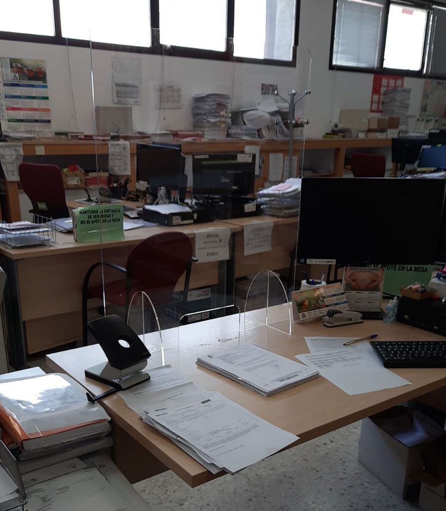 Allí, precisamente, “el primer día que pudimos trabajar con guantes y mascarillas fue el 30 de marzo, medio mes después de decretarse el estado de alarma”, relata Jesús Postigo, coordinador general de USO-Andalucía y funcionario también en Instrucción de Málaga. “Por suerte, la mayoría de los funcionarios no estamos ahora, durante la prestación de servicios esenciales, de cara al público. Para cuando a los funcionarios nos toca cumplir esa tarea, ya disponemos en uno de los puestos de mamparas de metacrilato”, añade.