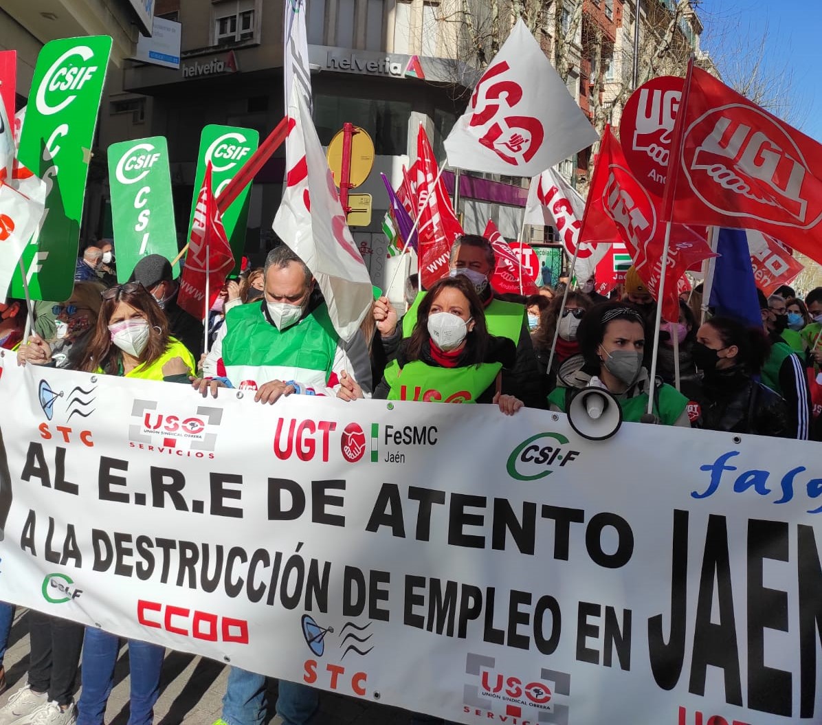 Cientos de personas han secundado la convocatoria de protesta que ha partido de la Subdelegación del Gobierno hasta el Ayuntamiento de Jaén. El Ayuntamiento ha aprobado una declaración institucional de apoyo y solidaridad con la plantilla y en contra de los despidos. También se han sumado al apoyo a la plantilla otros consistorios como los de Torredelcampo, Porcuna o Los Villares.