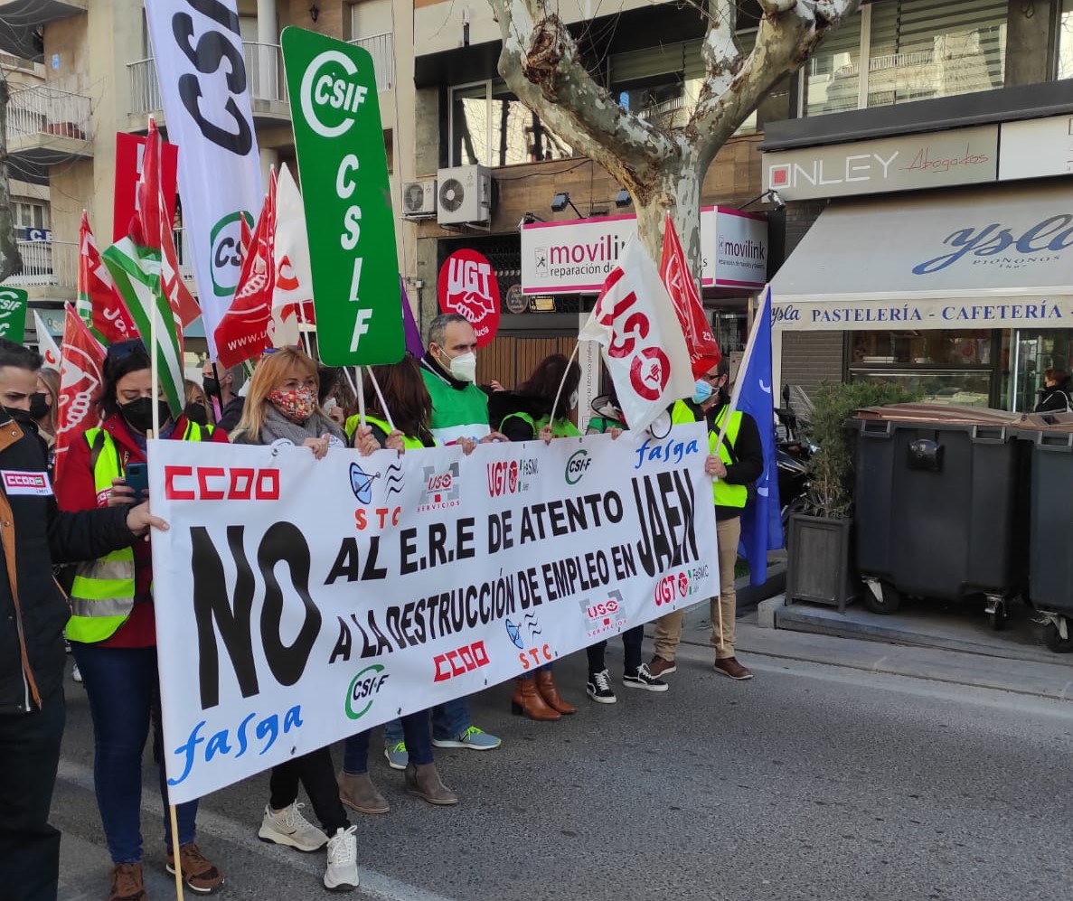 USO-Andalucía ha salido hoy a la calle para manifestarse junto al resto de sindicatos con representación en Atento Jaén contra el ERE que plantea la empresa y que afectaría a unos 150 trabajadores.