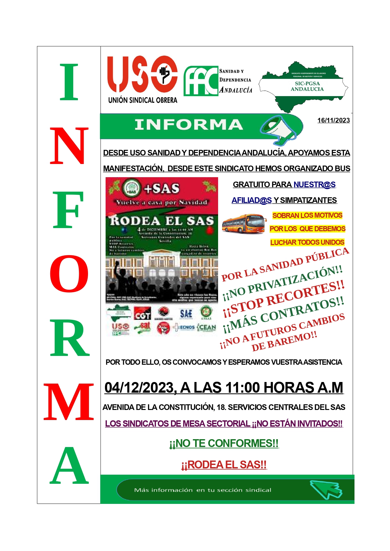 ciembre se ha convocado una concentración en la provincia de Sevilla por parte de la plataforma +SAS, los cuales nos invitan a todos los sindicatos no incluidos en mesa sectorial (USO, etc.) a participar y hacer visible la problemática que viene acarreando el SAS con respecto a la estrategia encubierta de privatización de bastante servicios, dentro de las categorías de gestión y servicios como han sido las categorías de limpieza, mantenimiento, pinche y ahora los compañeros/as de lavandería y planchado, además de una fecha próxima para la publicación de listados y migración a la nueva herramienta de Bolsa dentro de la VEC que ha sido una mera excusa para callar bocas y erradicar las múltiples denuncias por diferentes vías de este motivo.